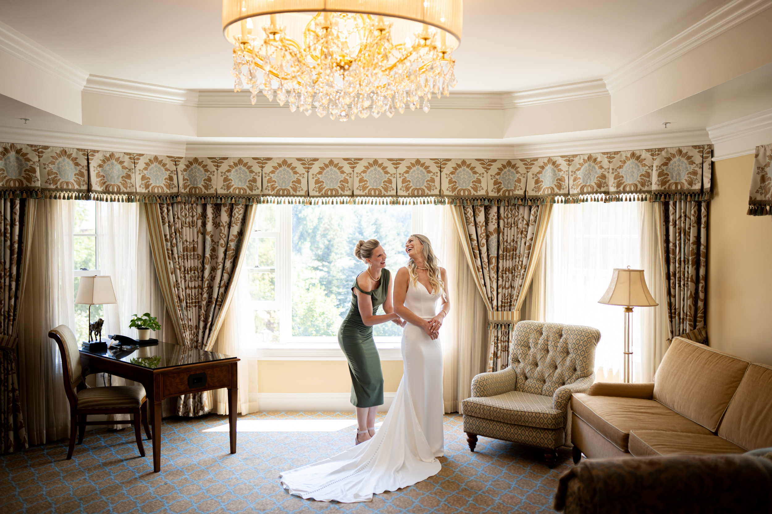 On the morning of their Broadmoor Hotel wedding, Liz got ready in a suite at The Broadmoor overlooking Cheyenne Lake. The room had a steady, upbeat buzz—music on, people coming and going, and lots of small conversations happening at once. Her bridesmaids helped with the practical moments, including zipping up her gown, but most of the time was spent simply hanging out, socializing, and being present together. For the day, all of her bridesmaids wore green! Adam prepared separately in another suite. His brother helped him get into his jacket.