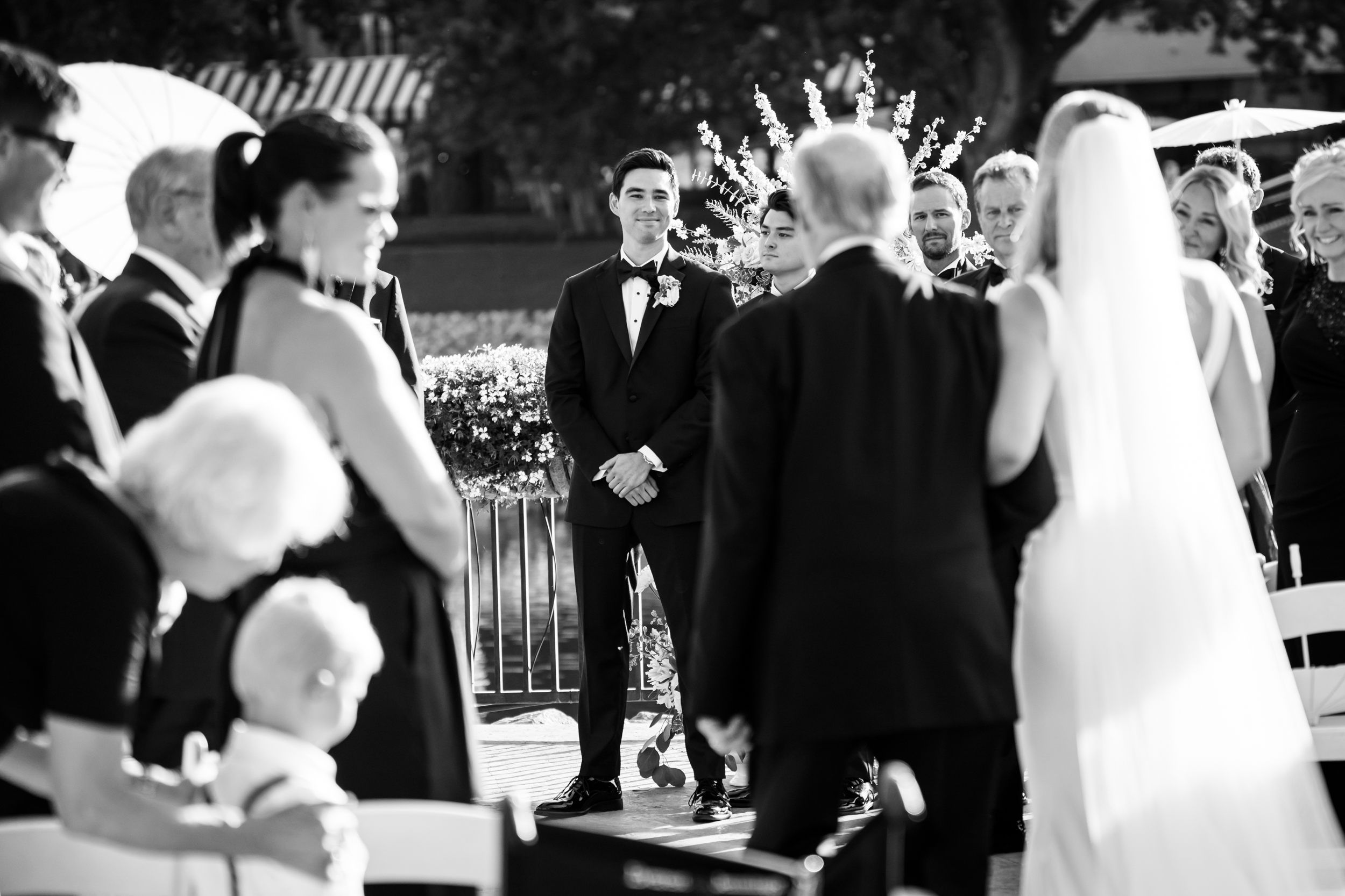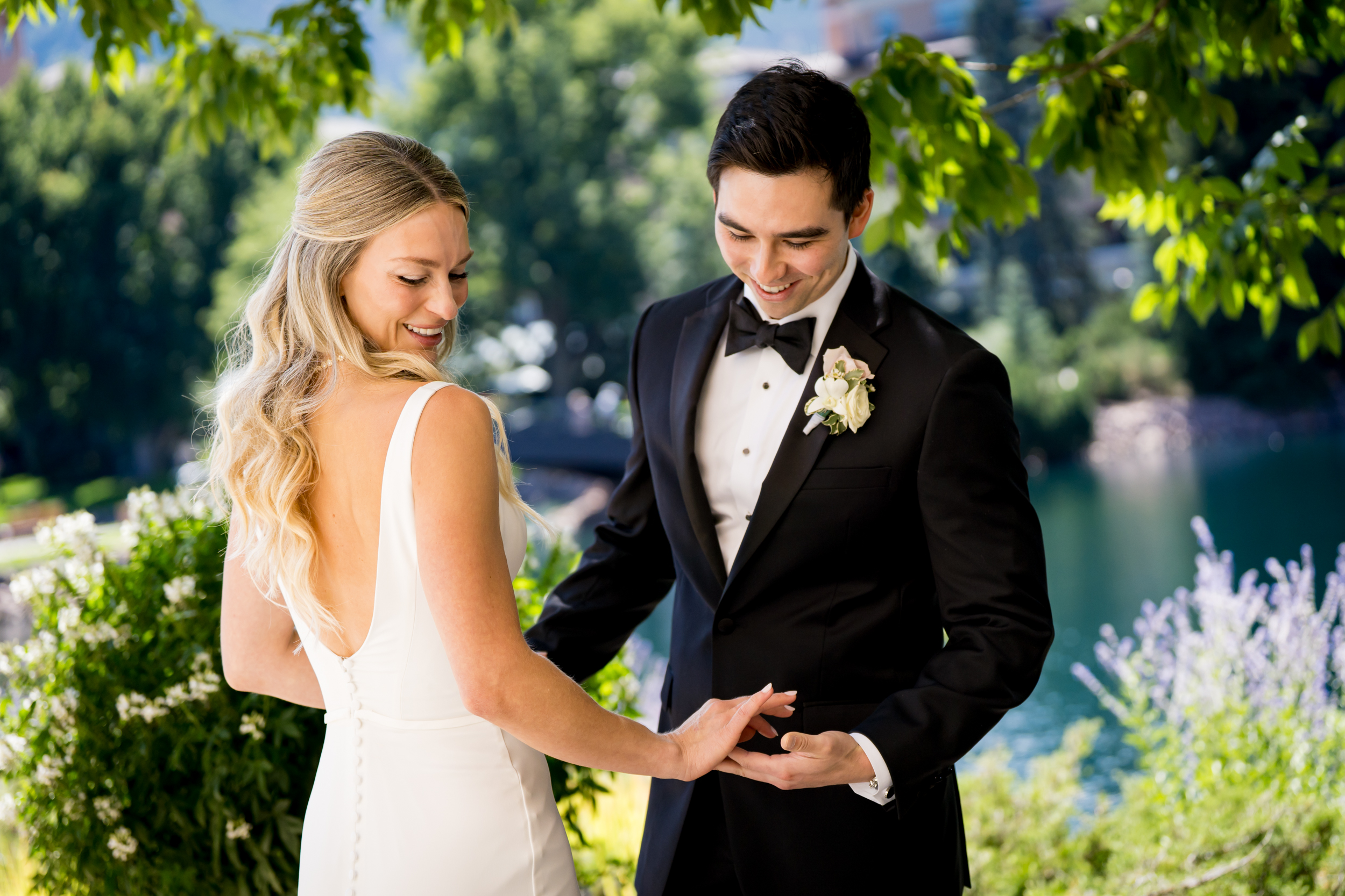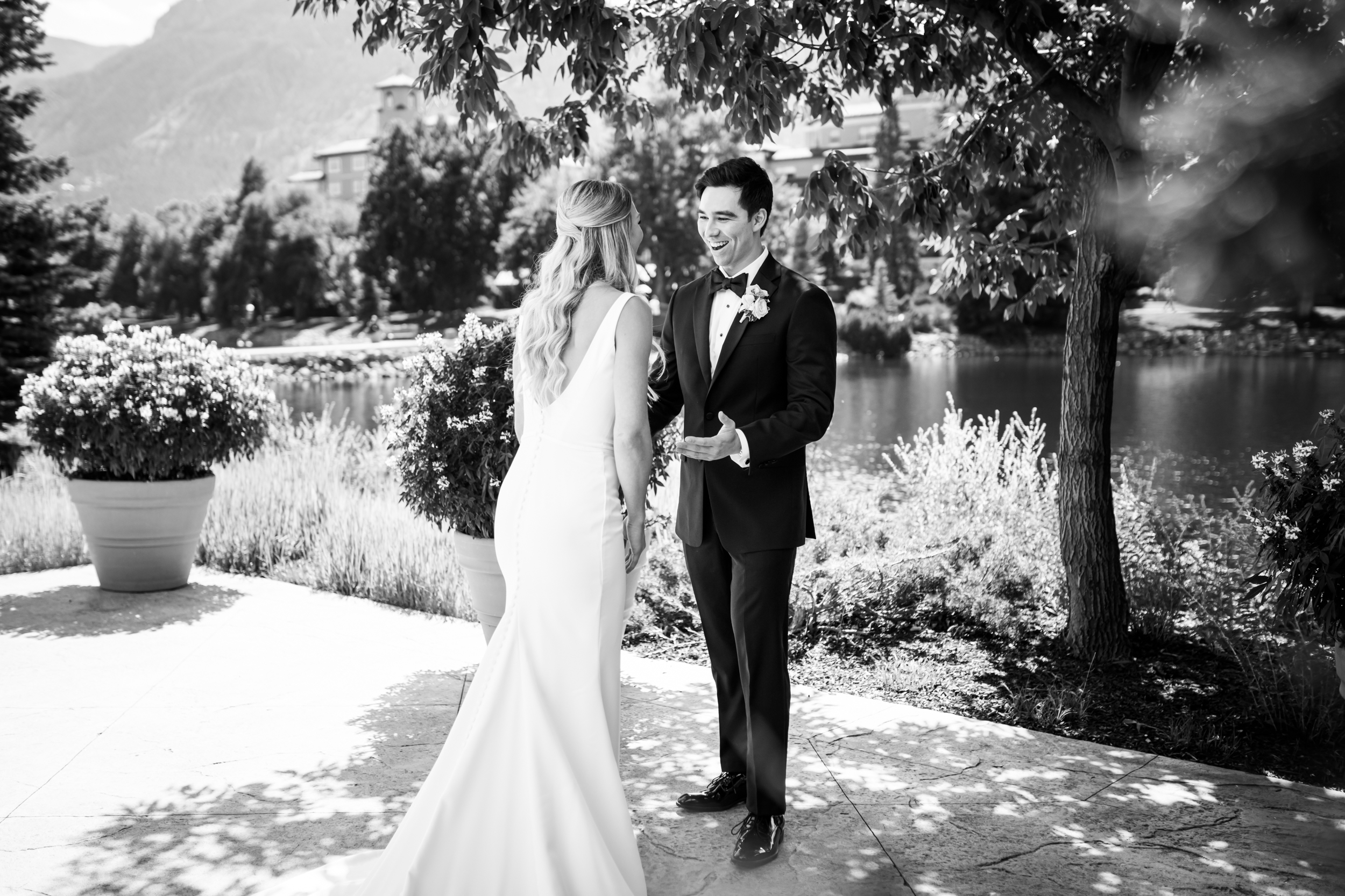 From there, Liz shared a first look with her dad, then headed outside the suite for her first look with Adam. Surrounded by greenery, flowers, and the lake—classic Broadmoor scenery—the moment felt naturally framed by the setting. Adam was thrilled to see her. He hugged her tightly, kissed her, and the two of them were visibly excited that the big day was finally here!