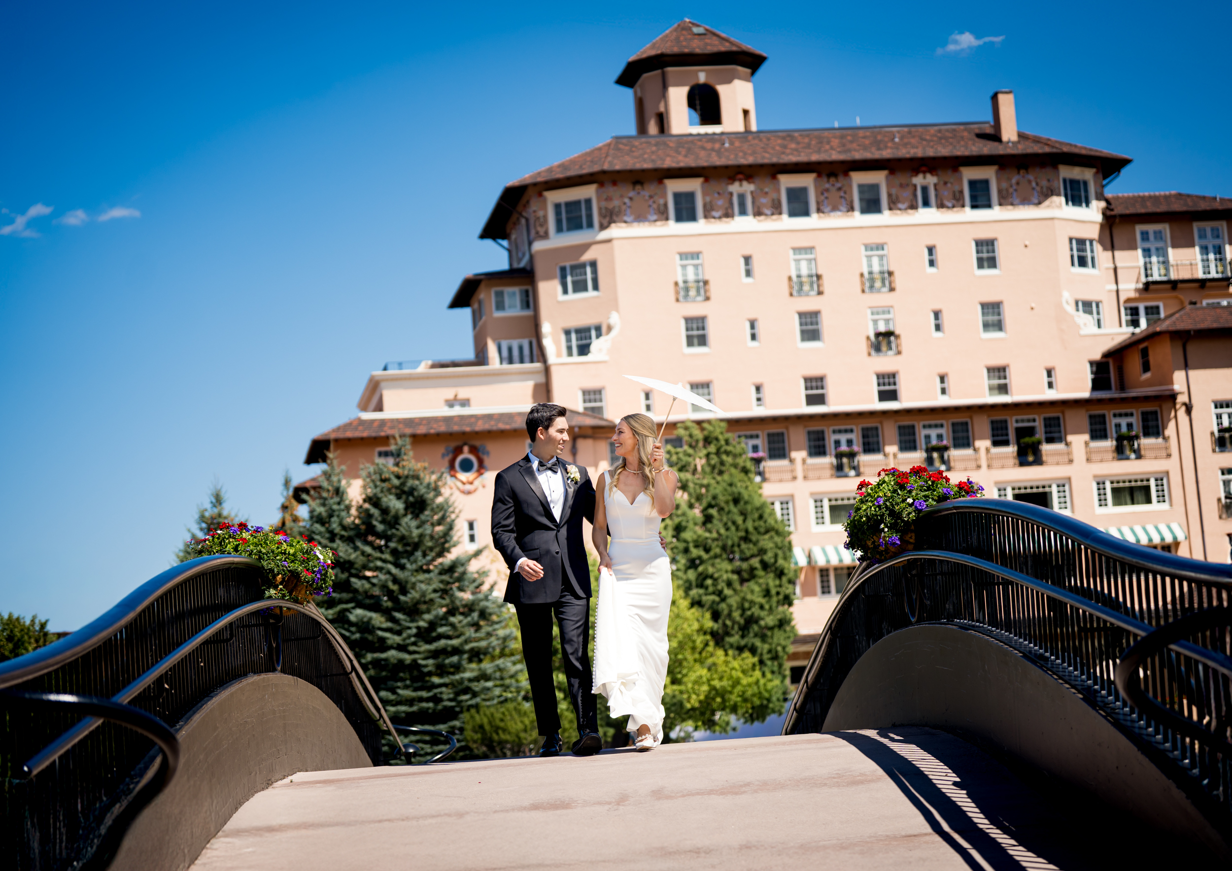 After that, we moved into newlywed portraits around the property. One of the biggest advantages of a Broadmoor Hotel wedding is how many great portrait locations are right on-site. We took photos over the bridge and on the far side of the lake near the West Lawn, with a clear view back toward the Broadmoor.