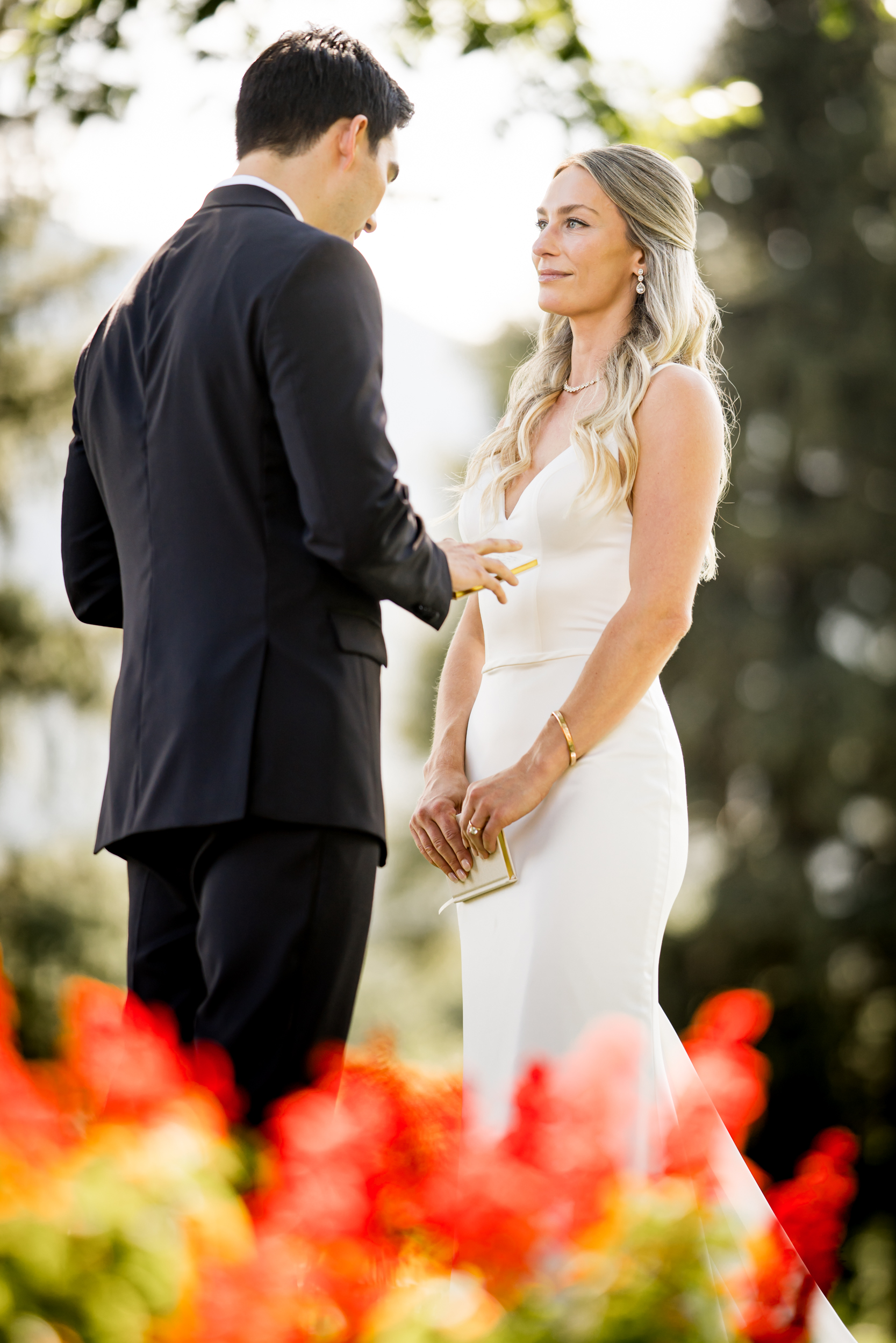 Next, we headed over toward the golf course for a more private part of the day. We found a shaded spot overlooking the mountains, tucked into a field of red flowers. It was quiet spot on a busy weekend, and it gave them room to slow down. There, they exchanged private vows with each other. They shared some laughs and tears, and we took a few portraits.