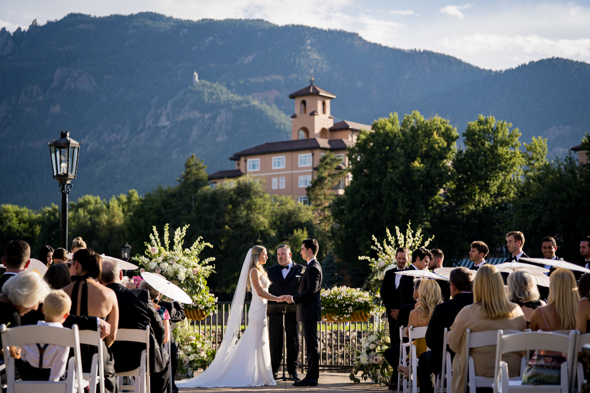 We returned in time for the ceremony at the Lakeside Terrace for their Broadmoor Hotel wedding, which has to be one of the most beautiful ceremony spots on the property. The backdrop includes the lake, showcases the hotel and ties the mountains together in one big beautiful bow. Liz walked down the aisle with her dad toward Adam. The ceremony balanced emotion with lighter moments—some tears, some laughter, and plenty of attentive faces in the crowd. When the ceremony concluded, Liz and Adam walked back down the aisle with guests cheering for the newlyweds!