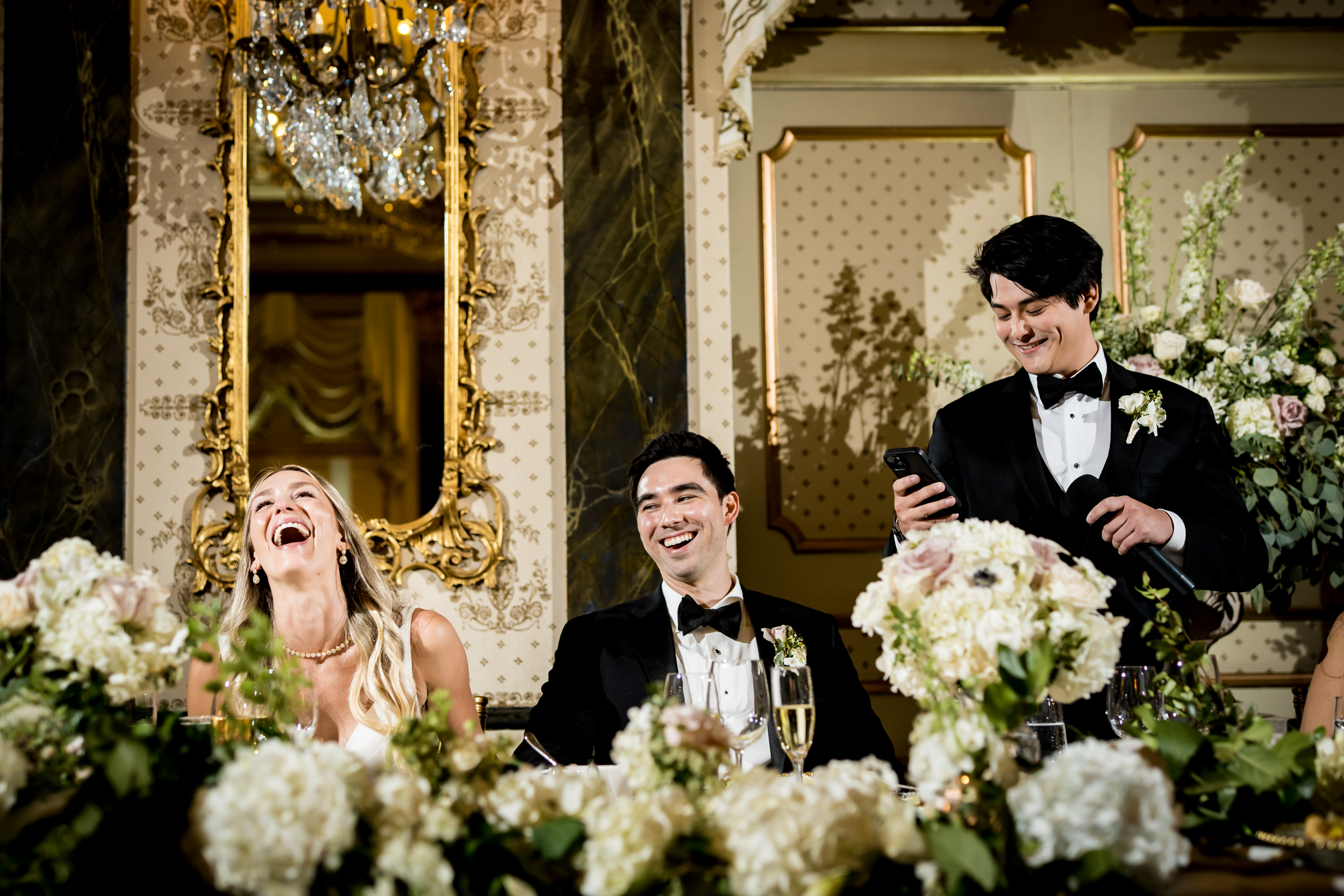 After the ceremony, they shared a brief post-ceremony prayer, then made a grand entrance into the main ballroom for the reception. Inside, Liz and Adam kicked things off with their first dance, followed by a champagne tower pour that became a natural focal point for the room. Toasts came next, first from Adam’s brother, then from the couple, before the dance floor opened and the celebration stayed energetic for the rest of the night! What an incredible Broadmoor Hotel wedding, definitely one for the books!
